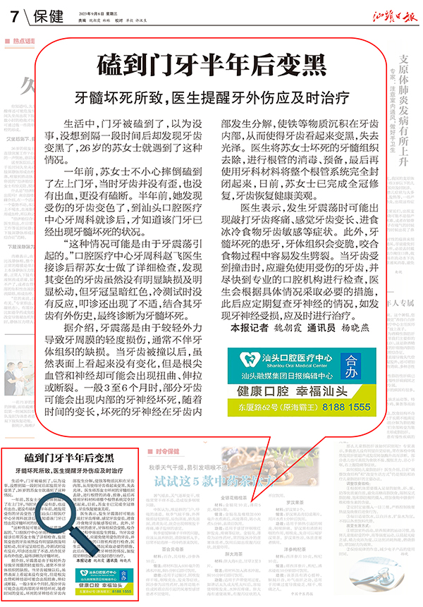汕頭日?qǐng)?bào) | 磕到門(mén)牙半年后變黑 牙髓壞死所致,醫(yī)生提醒牙外傷應(yīng)及時(shí)治療