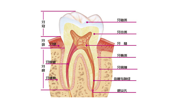 牙髓俗稱“牙神經(jīng)”位于牙齒的牙髓腔中,周圍被礦化程度較高的牙本質(zhì)所包圍,在牙冠_外層還有牙釉質(zhì)覆蓋,在牙齒的根部有牙骨質(zhì)覆蓋,牙髓組織一般通過狹小的根尖孔與根尖周組織聯(lián)系,牙髓組織中的血管、神經(jīng)、淋巴管都由根尖周組織通過根尖孔進入牙髓腔。